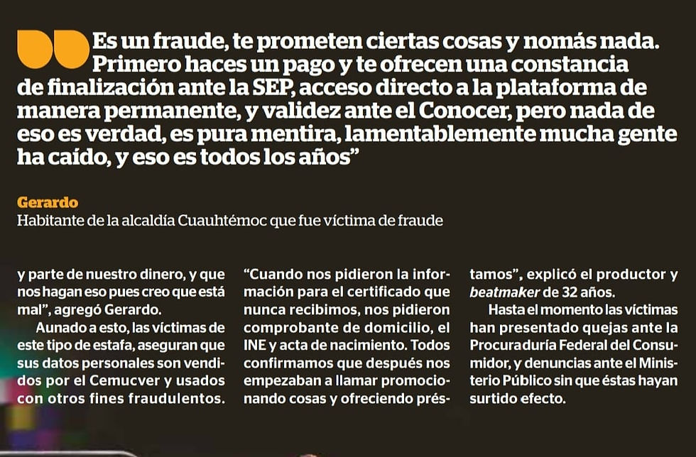 El periódico "Reporte Índigo" también revelo que que CEMUCVER pide los datos personales con pretexto para la certificación y venden las bases de datos donde muchos alumnos reportaron les empezaron a ofrecer y vender cosas después de dar sus datos a CEMUCVER.